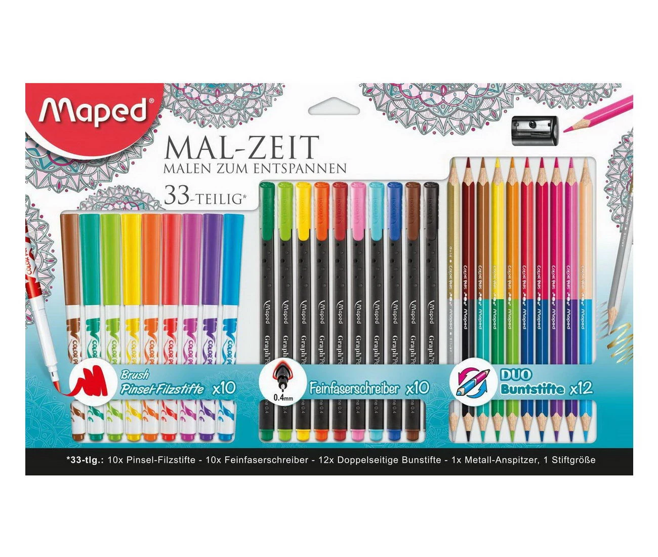 Das Malset ‚Mal-Zeit‘ von Maped besteht aus insgesamt 33 Teilen. Es beinhaltet 10 Pinsel-Filzstifte Color’Peps Brush, die dank ihrer ergonomischen Griffzonen ideal für künstlerische Zeichnungen wie zum Beispiel Comics, Mangas und für Kalligraphie sind. Die extra-flexible Pinselspitze hat einen Durchmesser 2,8 mm. Außerdem beinhaltet das Set 10 Fineliner Graph’Peps mit einer 0,4 mm breiten Metallspitze und praktischem Clip an der Kappe. Die ergonomische Form der Stifte sorgt für einen idealen Griff und ermüdungsfreie Handhabung. Des weiteren sind 12 Buntstifte Color’Peps Duo aus Lindenholz enthalten. Die Stifte bilden keine Splitter und besitzen eine weiche und bruchfeste Mine mit einem Durchmesser von 2,9 mm. Die ergonomische, dreieckige Form sorgt für idealen Griff.